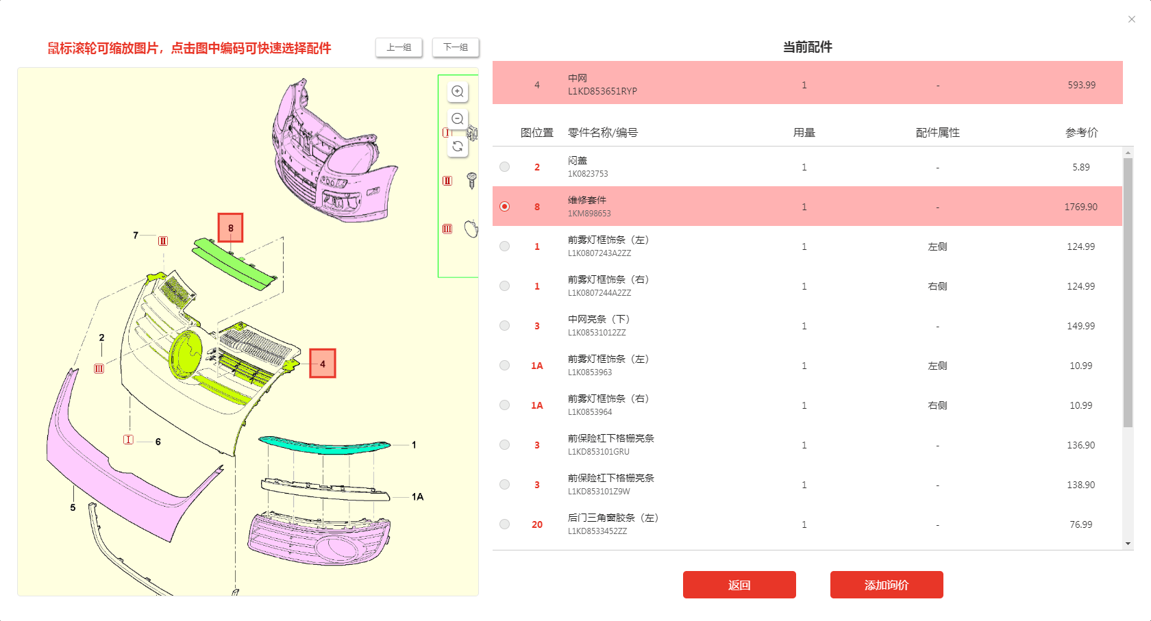 全品类覆盖:涵盖动力总成、底盘悬架、车身电气、内饰外饰等各大系统的配件报价。